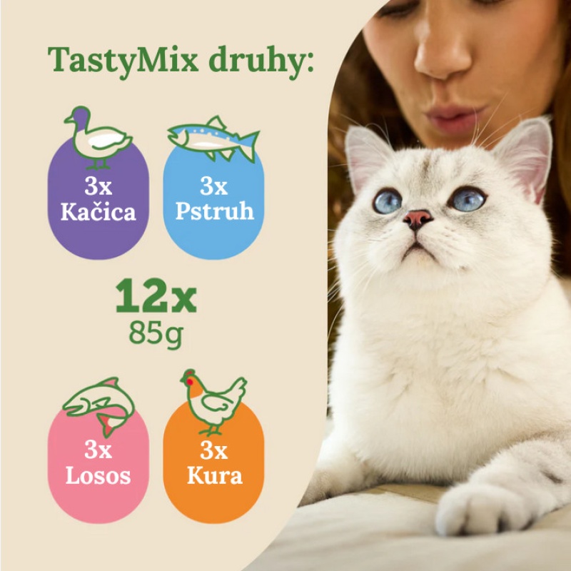 Tasty Mix Vyvážená a udržateľná strava – vďaka Cats Nature, perfektnému krmivu pre vašu mačku. Kapsičky Cats Nature Adult Tasty Mix (3x kačica, 3x pstruh, 3x losos, 3x kura) – Lahodná rozmanitosť pre dospelé mačky. Naše mokré k Úplný popis produktu